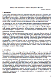 This document is a study report on climate change and disasters in Nawalparasi. Communities have witnessed changing weather patterns, with altered rainfall, rising temperatures, and increased incidents of winter fog, windstorms, hailstorms, landslides, floods, and droughts. These changes impact their livelihoods, and responses vary based on exposure and resilience. Summers are hotter with prolonged winter fog. Most striking is the erratic rainfall, intensifying in shorter bursts with longer gaps, leading to landslides and flash floods. Deforestation, overgrazing, and unplanned development exacerbate hazards. Drought, a growing problem, impacts crop cultivation year-round. Improved technology and socioeconomic changes enhance resilience, but increased temperatures affect mobility. Annual flash floods damage infrastructure and crops. Reduced hailstones contribute to drought.