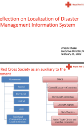 This presentation was delivered by Umesh Dhakal on the second day of the NCDRR, which focuses on Reflection on the Localization of Disaster Management Information Systems. In his presentation, he discussed the NRCS's insights into disaster information management, encompassing aspects such as flood monitoring, early warning systems, open street mapping, volunteer coordination, and warehouse management. Additionally, the presentation provides an overview of the workflow and applications of the initial rapid assessment system.