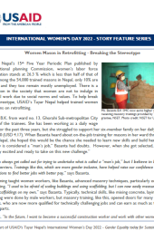 As outlined in Nepal's 15th Five Year Periodic Plan by the National Planning Commission, women's labor force participation remains significantly lower than that of men, standing at 26.3%. This disparity is particularly evident in technical fields, such as masonry, where only 10% of the 54,000 trained masons in Nepal are women, and employment opportunities are limited. USAID's Tayar Nepal initiative aims to challenge gender stereotypes by providing on-the-job training for women in masonry, specifically in seismic retrofitting. Basanta B.K. from Ghorahi Sub-metropolitan City, ward no. 13, embraced this opportunity, breaking societal norms associated with technical work. Despite initial doubts, Basanta successfully completed the training, gaining advanced masonry skills. Empowered by the gender-inclusive training, Basanta envisions a future as a successful construction worker, aiming to inspire other women to pursue similar career paths and contribute to reducing gender disparities in technical professions.