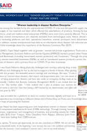 This document is one of the case stories among the featured stories on the occasion of International Women's Day which features and honors women leading and contributing to various roles for disaster risk reduction and management, challenging gender roles, and emerging as role models. The unprecedented COVID-19 crisis severely impacted businesses, particularly disrupting supply chains and causing shortages of raw materials and labor. Women-led micro, small, and medium-sized enterprises (MSMEs) were disproportionately affected due to their relative exclusion from technological tools, hindering online marketing and operational knowledge. USAID's Tayar Nepal, in collaboration with women-led organizations like Thulo.com and EMERGE, initiated the 'Fostering Resilience of Women-Led Businesses' project. This project aims to support women-owned/led MSMEs and home-based women producers nationwide in coping with the fallout of disasters, with a primary focus on the COVID-19 impact, addressing gaps in information on online marketing, disaster risk reduction, and business continuity planning.