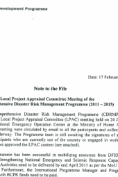This document is a note of the Local Project Appraisal Committee meeting of the Comprehensive Disaster Risk Management Program. The project strengthened the institutional and legislative aspects of DRM in Nepal by building the capacities of MoHA, other ministries, and local governments.