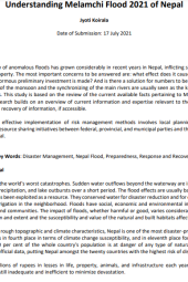 This document is a draft working paper on the Melamchi Flood of 2021. The increasing frequency of abnormal floods in Nepal has raised concerns about the effectiveness of the substantial initial investments made in flood management. The study focuses on the Melamchi Flood of 2021, attributing these disasters to the significant drop in monsoon rains and the synchronization of major rivers in Nepal. The research underscores the importance of preparedness, response, and recovery efforts, emphasizing the need for effective risk management that involves coordinated planning and resource-sharing among federal, provincial, and municipal entities, which is currently lacking in Nepal.