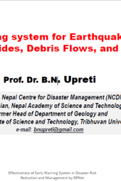 This presentation on Early Warning systems (EWS) for Earthquakes, Floods, Landslides, Debris Flows, and GLOF was presented by Prof. Dr.Bishal Nath Uprety on the 15th of May 2023 in a Policy Dialogue organized by DPNet on the Effectiveness of Early Warning System in Disaster Risk Reduction and Management. This presentation incorporates the disaster trends in Nepal, types of disasters, report analyses on disasters and data facts, and the need for new approaches in EWS.
