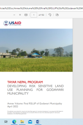 This annex volume is based on Tayar Nepal's Program on Developing Risk Sensitive Use Planning For Godawari Municipality. It is a comprehensive collection of annex I to XVIII including hazard zonation maps of wards, liquefaction potential, geotechnical properties of soil, different typologies of building, reclassification of different topologies, building footprint survey, ward-wise building type, exposure summary, water level survey, historical disaster level, field manual and many more. The document possesses the photographs collection representing overall field activities.