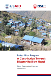 This document is an outcome of the evaluation study implemented under the Baliyo Ghar program which was implemented during 2015-2021 by NSET with funding support from USAID Nepal under the overall guidance and direction of NRA. This study evaluates the effectiveness and impact as well as the Baliyo Ghar program’s contribution towards overall reconstruction in Nepal. The specific aims of the study were to: