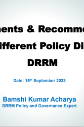 This presentation on “Commitments and Recommendations from the Different Policy Dialogues on DRRM” was prepared and shared by Mr. Bamshi Kumar Acharya during a National Dialogue on Disaster Management Policies. The presentation incorporates the information on the key commitments and recommendations proposed on policy dialogues regarding Psychosocial counseling in disaster, efficiency of EWS in DRRM, Private sector investment in disaster, good governance for RRM across the three tiers of government, Market system resilience for DRR, Disaster Risk Transfer and Financing for enhanced DRR, non-government engagement for DRRM along with the key issues in provisional, institutional, operational, and behavioral levels in disaster management. Furthermore, the presentation attempts to give a way forward in formulating policy provisions, mobilization of funds and human resources, coordination of concerned stakeholders, monitoring and evaluation along with delineation of powers between the government for enhanced disaster risk reduction and management.