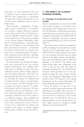 This study on the effects of climate change in Nepal highlights the country's vulnerability due to underdeveloped infrastructure, challenging governance, and diverse geography. The impacts of climate change in Nepal are summarized as changes in temperature and rainfall, disasters triggered by extreme climate events, and gradual environmental changes. It notes rising temperatures, especially at higher elevations, leading to reduced snow and ice cover and altered river currents. Nepal faces extreme events like floods and droughts, with projections of increased precipitation during the rainy season, varying across regions. Climate change increases the risk of natural disasters like landslides and floods, posing serious threats to infrastructure, agriculture, and human life, especially in hilly and mountainous areas.