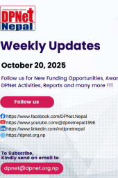 DPNet Nepal’s Weekly Update – 20th October 2025 features key national and global opportunities in climate change, disaster risk reduction, and sustainable development. Highlights include the Smithsonian Institution Fellowship 2025–27, UKRI Future Leaders Fellowships, International Seminar on Geography in the 21st Century, Russell E. Train and ICON Fellowships, and a South Asia Field Course on Vulnerability and Risk Assessment. Additional openings cover training for electric mini/microbus mechanics, sustainable water management, and the UNFCCC–UNU Early Career Climate Fellowship. Scholarship opportunities feature the DAAD Joint MSc in Geography of Environmental Risks, Saudi Government Scholarships 2026, Ireland Government Postgraduate Scholarships, IsDB, Yenching Academy, and University of Antwerp’s Master’s in Development Studies. Awards and grants include the Earth Prize, House of No Waste Competition, World Sustainability Award 2026, GEF Small Grants Programme, and the Environmental Photography Award 2025. Funding and vacancy calls include the German Embassy Nepal Small-Scale Project Funding 2026, UNICEF Climate Innovation Challenge, and consultancies on climate-resilient agriculture and policy formulation. Recent news highlights DPNet’s dialogues on heat and fire risk, monsoon preparedness, and the upcoming IDDRR and 4th NCDRR 2025.
