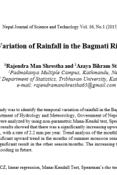 The main aim of the study was to identify the temporal variation of rainfall in the Bagmati River basin, Nepal using data available at the Department of Hydrology and Meteorology, Government of Nepal. The time series data for the period of 1981-2008 were analyzed by using the non-parametric Mann-Kendal test, Spearman’s’ Rho and parametric linear regression. The results showed that there was a significantly increasing upward trend of the annual mean of weighted areal rainfall, with a rate of 2.2 mm per year. Trend analysis of the monthly time series of weighted areal rainfall showed a significant upward trend in the months of the summer monsoon season (June and July). However, there were no such significant results in the other seasons/months. The increasing trend in the summer monsoon might lead to severe flooding in the future.