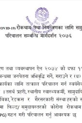 The Community Volunteer Mobilization Guideline for the Prevention and Control of COVID-19 "कोरोना महामारी रोकथाम तथा नियन्त्रणका लागि समुदायमा स्वयंसेवक परिचालन सम्बन्धी मार्गदर्शन, २०७६" is formulated concerning the DRR&M Act 2017. The guideline includes the structure of the volunteer group, volunteer selection criteria, coordination and management, roles and responsibilities of the volunteer group, safety and motivation, etc.