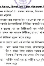 Under the authority granted by the Government of Nepal, this guideline on COVID-19 Prevention, Control, and Treatment Fund Mobilization was issued to establish the coronavirus (COVID-19) Prevention, Control, and Treatment Fund. The fund procures and distributes COVID-19-related medicines and equipment, as well as manages facilities for quarantine and treatment, following approved guidelines and under the Government of Nepal's direction.