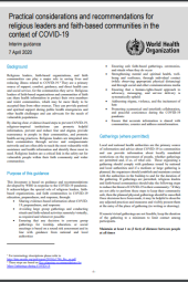 This document, derived from WHO guidance in response to the COVID-19 pandemic, recognizes the crucial role of religious leaders and faith-based organizations in COVID-19 education, preparedness, and response. It emphasizes sharing evidence-based information, conducting remote faith-related activities, and making decisions on group gatherings based on risk assessments and national guidance. The document also underscores the importance of ensuring safe gatherings, promoting mental and spiritual well-being, adopting a human-rights-based approach, addressing stigma and violence, and fostering ecumenical collaboration to counter misinformation during the pandemic.