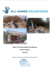 Following the devastating 7.8 Richter earthquake in Nepal on April 25, 2015, and subsequent aftershocks, numerous buildings, including schools and government structures, were severely damaged or destroyed. The aftermath left a considerable number of structures hazardous and in need of demolition to facilitate safe reconstruction. All Hands Volunteers (AHV) and other NGOs conducted assessments in Kathmandu and Sindhupalchowk districts, revealing challenges, particularly in the face of government cash grants for homeowners awaiting official damage confirmation. The Nepalese Army, tasked with demolition, lacks essential resources and seeks assistance. AHV and Engineers Without Borders (EWB) volunteers conducted practice demolitions in Sindhupalchowk, focusing on schools due to limited heavy equipment availability. This manual emphasizes safety procedures, and building assessments, and provides guidelines for effective demolition in the reconstruction process.