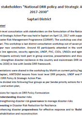 This document is an event report of a workshop conducted in Saptari District. The workshop marked the final consultation in a series of seven planned across different provinces. The participants actively engaged in group exercises, presentations, and discussions to contribute to strengthening the country’s disaster resilience and integrating disaster risk reduction into long-term development plans from 2017 to 2030, aligning with the Sendai Disaster Risk Reduction (DRR) framework. The workshop included presentations on current policies and legislation, local DRR initiatives, lessons from local-level DRR projects, and updates on the National DRR Policy and Strategic Action Plan. Participants were divided into four groups based on Sendai’s priority actions to provide input on the National DRR policy and action plan, focusing on understanding disaster risks, enhancing disaster risk governance, investing in DRR for resilience, and improving disaster preparedness and recovery efforts.