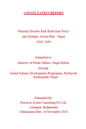 This consultation report on National Disaster Risk Reduction Policy and Strategic Action Plan includes the approach and methodology adopted to conduct the overall consultation process charted for the preparation of the National DRR Policy and Action Plan. It includes a summary of discussions held as of the date and the outcomes of the consultation. It also includes the guiding questions for consultations with key organizations and professionals engaged in DRM.