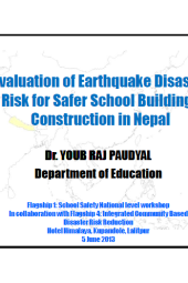 The presentation prepared and shared by Dr. Youb Raj Pradhan focuses on the Evaluation of Earthquake Disaster Risk for constructing safer school buildings in Nepal. It begins by providing insights into the earthquake history of Nepal and highlights the vulnerability of the Kathmandu valley. The presentation also includes observations from the eastern and western regions of Nepal. In the eastern part, the major issue lies in construction quality, whereas there are no significant problems with the design. On the other hand, in the western part of Nepal, the problems range from major to minor in terms of design, with additional concerns related to construction quality as well. The presentation delves into the vulnerability of school buildings to earthquakes and discusses strategies to overcome these challenges in Nepal.