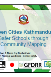 This presentation focuses on "Open Cities Kathmandu: Safer Schools through Community Mapping." Its main objectives are to map key points of interest and critical infrastructure in the Kathmandu Valley, collect exposure data for schools and health facilities, share this data openly through systems, and raise awareness while building a community around open street mapping and open data in Nepal.